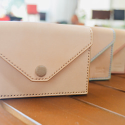 自然な風合いのヌメ革と、ポップなカラーのくるみボタンがワンポイントのさわやかで、小さいくてかわいさのある三つ折り財布になります。