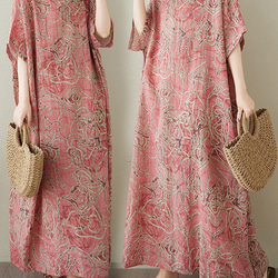 新型綿麻プリントエスニック通勤半袖ロングワンピース女性太ったmmサイズ婦人服