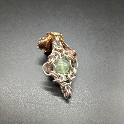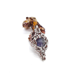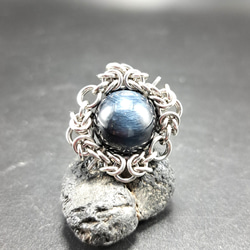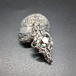 天然石の大きさに合わせ、円形のサージカルステンレス(マルカン)を1つ1つ何十個も手作業で複雑に編み上げていくチェインメイルと呼ばれる技法を使い制作されたアクセサリーです。