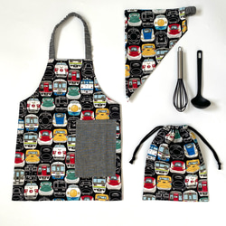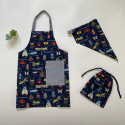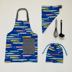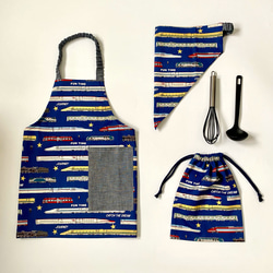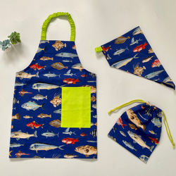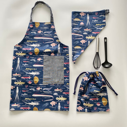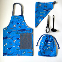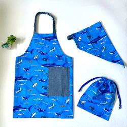 くじらと海の生き物柄がカッコいい、子供用のエプロンセットです。