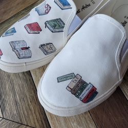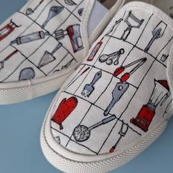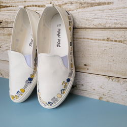 耐水性の画材を使用し、布地全体に防水の塗料を塗って仕上げています。通常の靴と同じように洗うことができますが、長く使っていただきたいので、雨の日のご使用・ブラシで強くこする・水につけ置きなどはお控えください。その他詳しいお手入れ方法は商品と一緒に送付いたします。