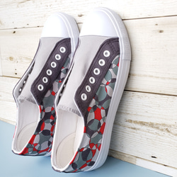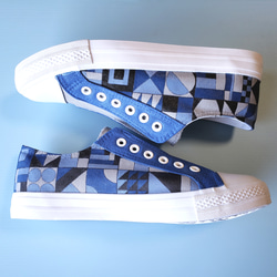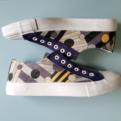 規則正しく描かれたたくさんのひし形が、サイコロ "dice" が並んだような立体にも見えるインパクト大のデザインです。幾何学模様は使用する色によってさまざまな印象を与えます。掲載写真の他にもお好みの配色で制作できます。ぜひ他の人とは違うあなただけの一足をお作りさせてください。