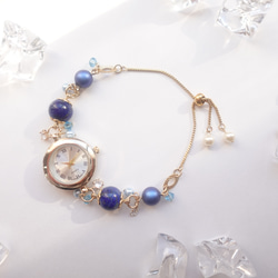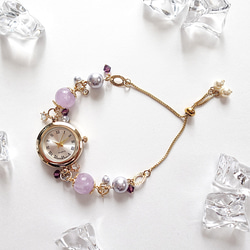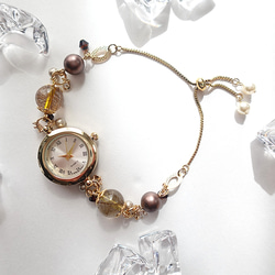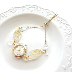 四つ葉のクローバーをパールと共にレジンに閉じ込めたブレスレットウォッチです。