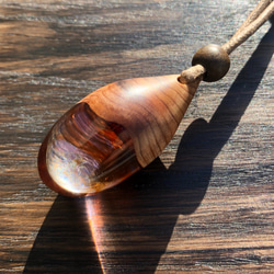 熟練の手磨きによって、クジラ歯・銘木・レジンが一体となり、光の角度で多彩な表情を見せるトップ。