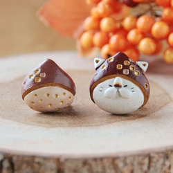 ころんとしたフォルムが可愛らしい2匹のどんぐり猫のブローチです。