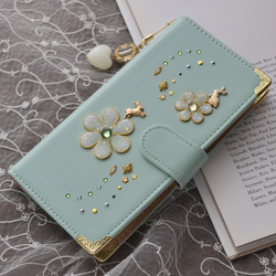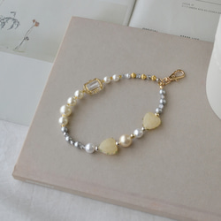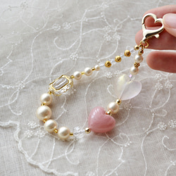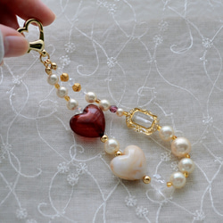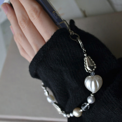 くもりガラス風のハート(アクリル製)、ダマスク模様のドイツ製ドロップビーズ、シャープな三角錐のビーズ、金具の形にもこだわり、一つ一つ素材をセレクトして個性的なストラップをお届けします。