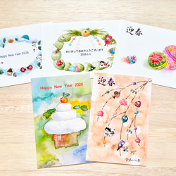 透明水彩画「2026年 午年年賀状4枚セット」 馬 うま ウマ お正月 お年賀 ちぎり絵 出産祝い お正月飾り 鏡餅