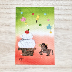 ★馬 うま ウマ 午年 ちぎり絵 貼り絵 年賀状 お年賀 お正月 お正月飾り 鏡餅 羽子板 ニンジン にんじん 野菜 ピアノ クマ 車 リボン 動物 カード marron125 marron 水彩 水彩画 透明水彩 透明水彩画 イラスト ポストカード メッセージカード バースデーカード お誕生カード サンキューカード 出産祝いカード