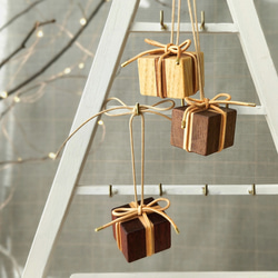 彩り豊かな広葉樹の寄木に革紐のリボンを巻き、ギフトボックスに見立てたチャームを作りました。