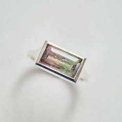 エメラルドカットの濃い水色のモスアクアマリンをシンプルに直線と曲線を活かしたソリッドなデザインの指輪にセッティングしています。