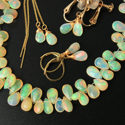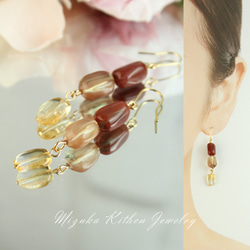 チャロアイトとイエローアンバーをメインに、グリーンオパール、ガーネット、カーネリアン等を組み合わせて「実りの秋」をテーマに3シリーズ(各ネックレス・耳飾り)を製作いたしました。