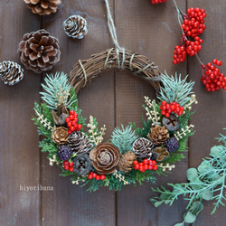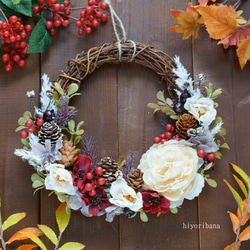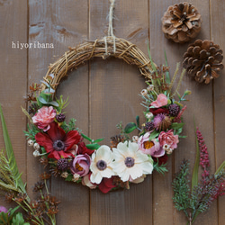 花と葉っぱはアーティフィシャルフラワーですが、赤い実以外の実物は本物なので、フレッシュリースのような質感ながら毎年飾れるリースになっています。
