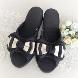 スリッパはシャンタン素材のヒールスリッパで、とても高級感があり、リボンが上品で4㎝のヒールが足を長く綺麗に見せてくれます。