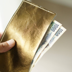 見かたによって落ち着いたブラウンにも、華やかなゴールドにも見えて素敵な札入れですね!