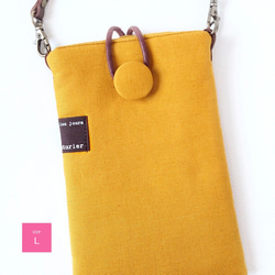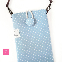 ※縦長のスマホで手帳型のスマホケースをお使いの方はスマホポーチ(L)で入りますが、5mm程スマホがはみ出してしまい、そのままではボタンが止まりませんのでお気をつけください。