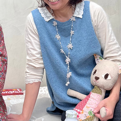 前身頃には編み柄、後ろ身頃にはスリットが入っておりかわいらしいデザインです。
