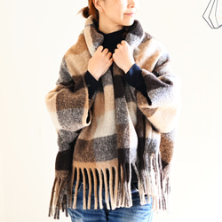 ライトグレー地にダークレッド・ブラック・ミックスグレーのランダムな格子の織り模様が映えます。比較的ダークな色目のコーディネートになりがちなこの季節に、お出掛けの足取りも軽くなるお色のショールカーデです。