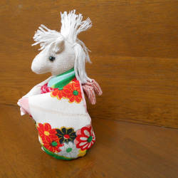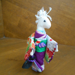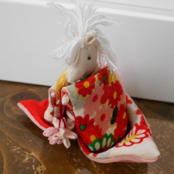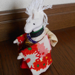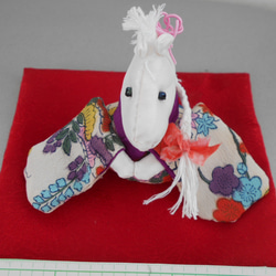 白馬は、神様のお遣いとも言われているようですので、縁起を担いで白馬にしました。着物の古布のちりめんを使用しています。