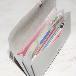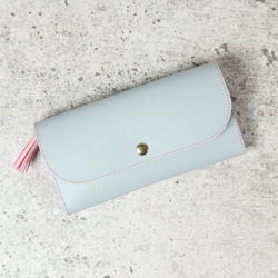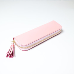 ペールグレーとさくら色のバイカラー牛革をピンク色の糸で縫製しました。