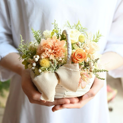 ベースのグリーンにはプリザーブドフラワーを使用しており、リアルでソフトな質感です。
