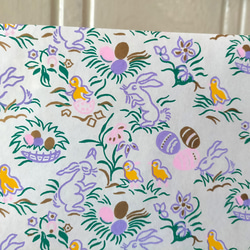 薄手ですが、ハリのある紙質です。アイボリーホワイトのベースカラーに、コーンスワッグやドアノッカーに仲良くとまってさえずる小鳥達が描かれています。ふゆげのふわふわした姿がなんとも愛らしく、まるで絵本の1ページのようなあたたかみのある絵柄です。
