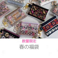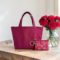【母の日ギフト】カーネーション/インド刺繍×帆布◆カラビナ付きフラットポーチ/マルチケース