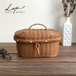 クラフトバンドの中でも、ツヤ、ハリがあり、汚れにくく、色褪せ、色落ちの少ない高品質のものを使用しています。そのため、重い物を入れても型が崩れにくく、このぷっくりした形を保つことができます。