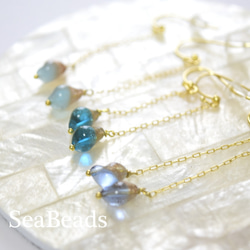 動くと、いろいろな形と色味で集めた光が胸元で上品に輝きます。