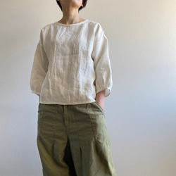 名前の通りゆったり着こなせるサイズ感で、裾には紐を通し、絞って結んだり伸ばしてスッキリしたりと2wayで楽しめるデザインです。品の良いリネンの洋服はキレイな感じでもカジュアルな感じでも合わせやすく、パンツでもスカートでも合わせやすいデザインとなっております。袖は折り返したデザインですが伸ばしてもご使用出来ます。その場合は5部丈位になります。