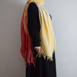 細い麻糸で織られた生地をたっぷり使ったストールを着尺や帯を染める手法で、草木染めしました。