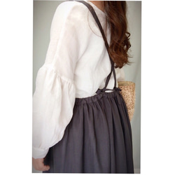 ドロップショルダーから袖のギャザーは控えめに細かく取り、バルーンスリーブの膨らみを可愛らしく表現しました。身頃はとてもシンプルで、大人のオシャレ感がでるように仕上がりました。とても動きやすく、リラックス出来ます。