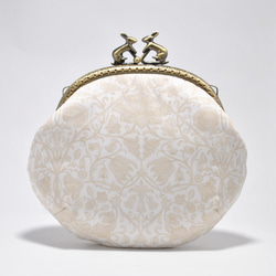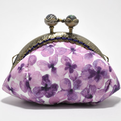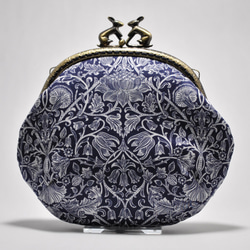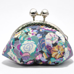リバティプリント ロデン・ウッド ピンク&ブルーとアンティークゴールドの丸い縫い付けタイプの口金を使用した、がま口ポーチになります。