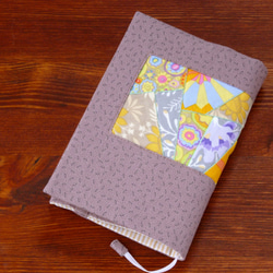 写真 2 枚目は内側、3 枚目はマットの表と裏です。パッチワーク部分はグレーやベージュなど穏やかな色合いの布地を合わせました。裏面はパウダーブルーの地に淡いイエローの花柄です。