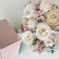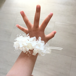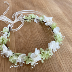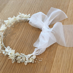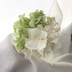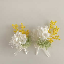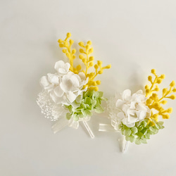 アーティフィシャルフラワーのミモザと、プリザーブドフラワー のアジサイ・かすみ草を使用しており、後ろには簡単に付けられる様ピンがついております。