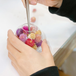 ・ドライフラワーを一つ一つ丁寧に、ピンセットで入れています。
