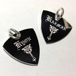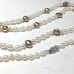 珍しいカットのつや消しオニキス2ピースと、真ん中に大きめ淡水パールをあしらい、ライス形の淡水パールでまとめました。