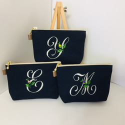 選べるお花のイニシャル刺繍の巾着ポーチです。