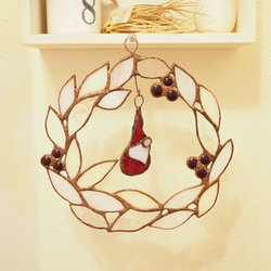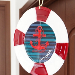 こちらのガラス表札は、透明系の深い赤のガラスを使っています。アクセントにプクっと凹凸をつけて焼いたガラスのラインを2本つけています。