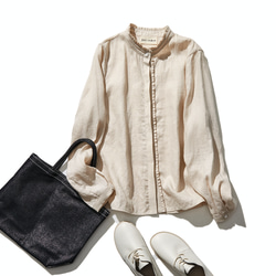 想像通りの優しいオートミール色で、とっても素敵です。襟元のフリルや、前ボタンが隠れるデザインに惹かれて購入しました。サイズもぴったりで満足です。オンオフ両用したいと思います。同じデザインで白やピンクがあれば欲しくなりそうです。