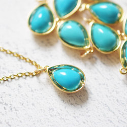 綺麗にカットされたターコイズの耀きと金色のチェーンのバランスがとても良く、気分によってネックレスにもブレスレットにもできるところが素晴らしいです。